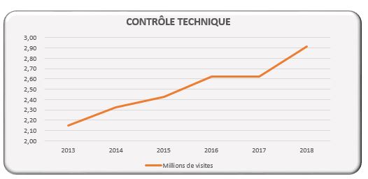 En 2018, 2 913 771 visites de contrôle technique ont été réalisées dans les 420 centres ouverts sur le territoire national. Cette activité est également en plein essor : depuis 2013, elle a connu un taux de croissance annuel moyen de 5,2%.