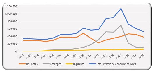 - Une baisse d’environ 10 points par rapport à 2002, période à laquelle le taux de réussite était de l’ordre de 95%. Si le cadre de l’examen théorique s’est progressivement renforcé, celui de l’examen pratique reste à améliorer de manière significative. En 2018, les Centres Immatriculateurs du Royaume, qui relèvent désormais de la NARSA, ont délivré 529 763 nouveaux permis de conduire, procédé à l’échange de 96 281 permis de conduire et délivré 54 716 duplicata.